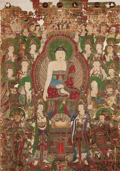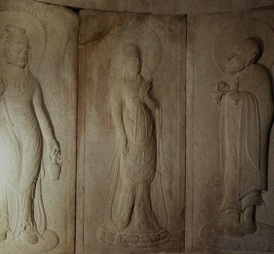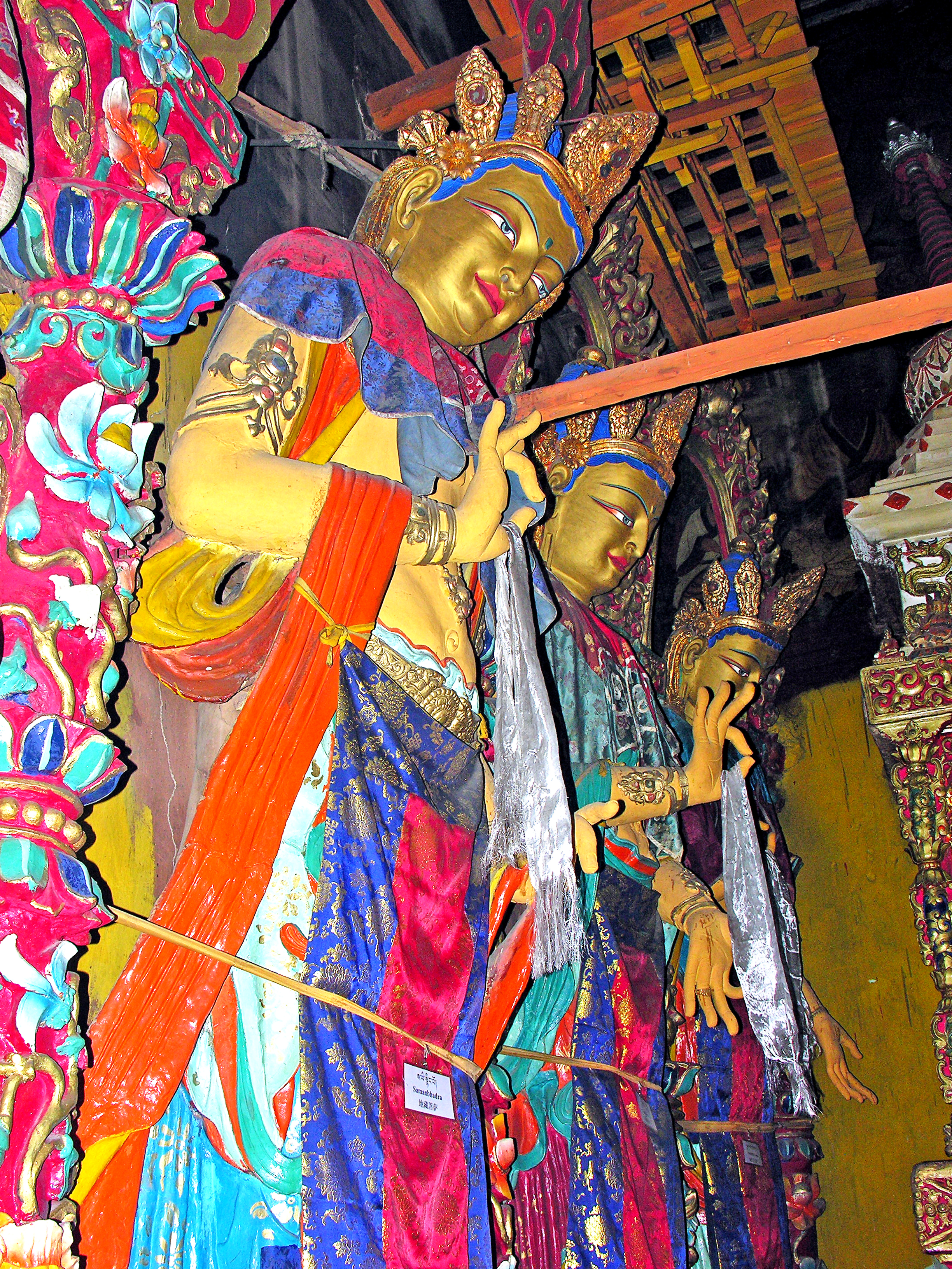 가운데 큰 인물이 석가보니, 석가보니 무릎 아래 서 있는 두 명 중 오른쪽 문수보살, 왼쪽이 보현보살이다. 석가모니 불상이 있는 곳에는 늘 문수보살과 보현보살이 좌우로 함께 있다. 이것이 바로 보현보살의 클라쓰인 것.