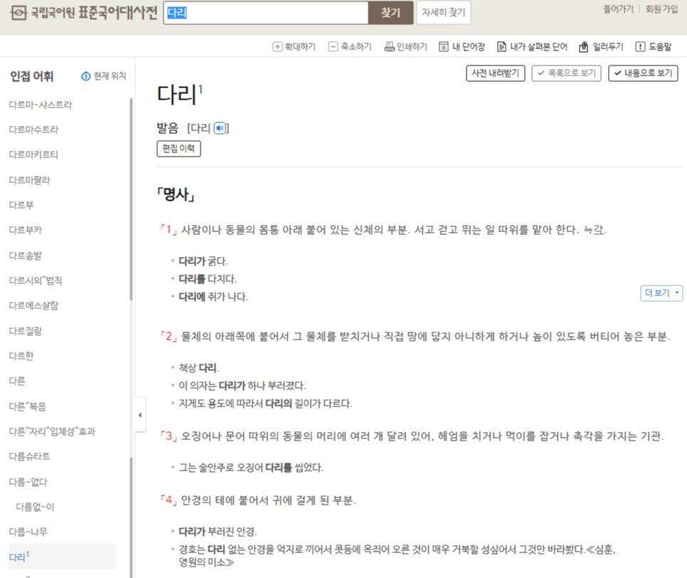 첫번째 단어인 '다리1'의 전체보기를 눌러 들어가 봅니다.
