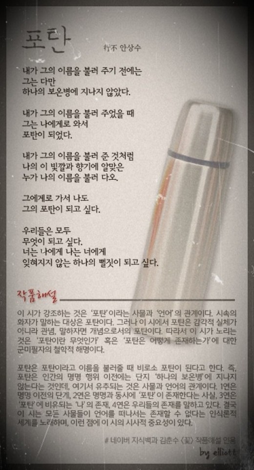 맨 위 사진으로 실린 시는 김춘수 시인의 '꽃'을 패러디하여 이 보온병 폭탄을 노래한 시입니다.