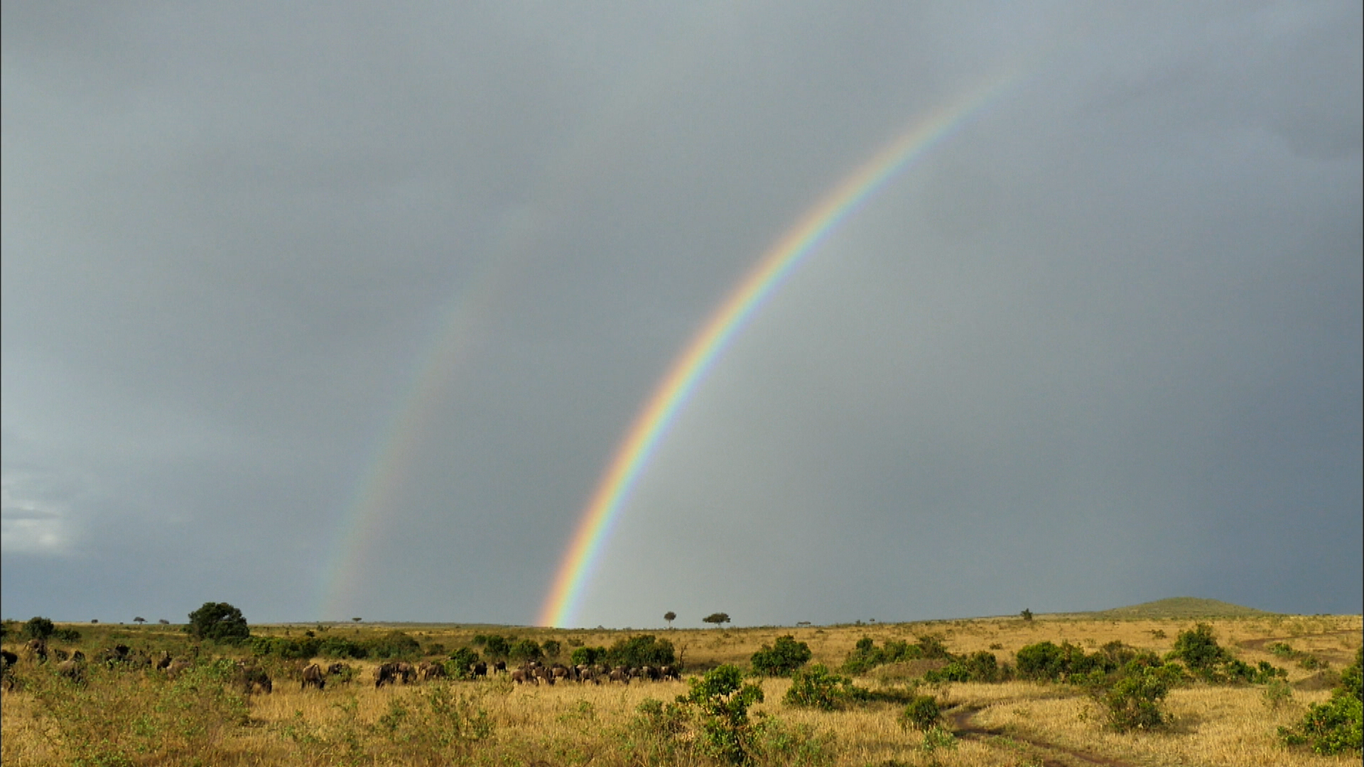 동시에 저편 벌 건너 숲 위에는 둥그렇게 무지개가 뻗쳤다. 오묘한 조물주의 재간을 자랑하듯이 칠색이 영롱한 무지개가 커다랗게 숲 이편 끝에서 저편 끝으로 걸쳐 있었다.