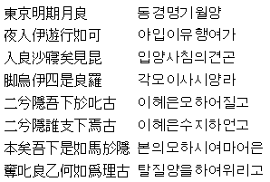 위에 있는 피곤한 문자들의 향연은 오른쪽은 삼국유사에 실린 처용가 본문,